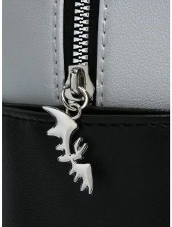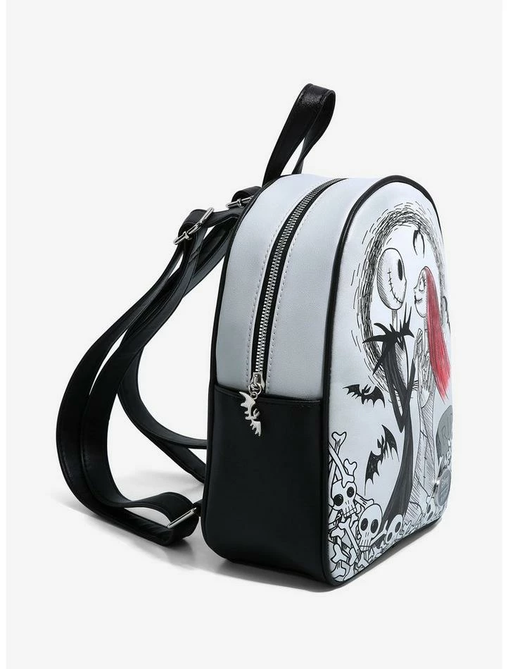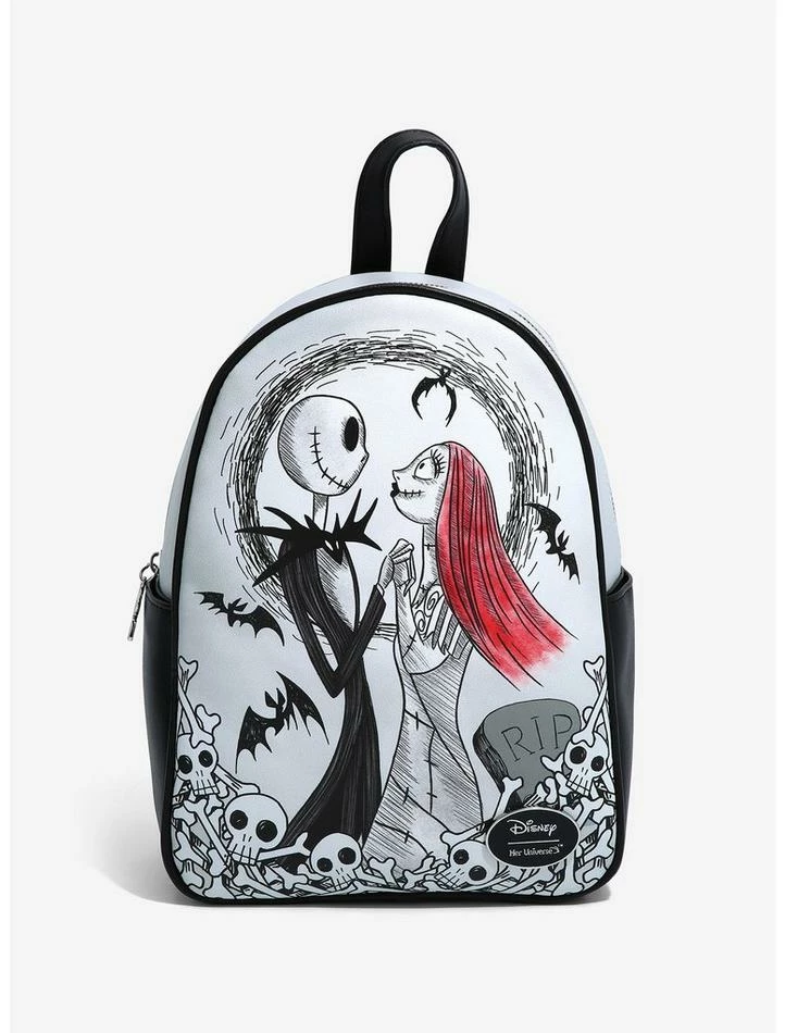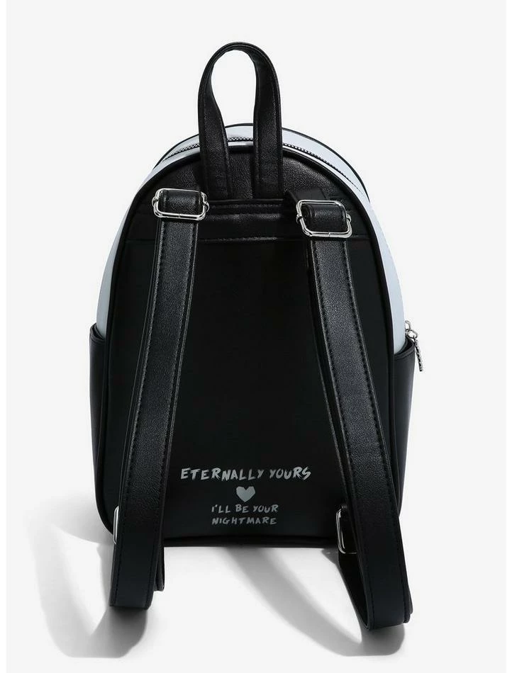 Taking a short trip to Halloween Town? You’ll want to pack your essentials into this mini backpack! Just like Jack & Sally, you and this backpack from The Nightmare Before Christmas were simply meant to be. Features a large illustration of Jack & Sally on the front, with “Eternally yours” and “I’ll be your nightmare” on the back. Comes with side pockets, interior drop pocket and bat zipper charm.