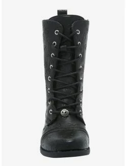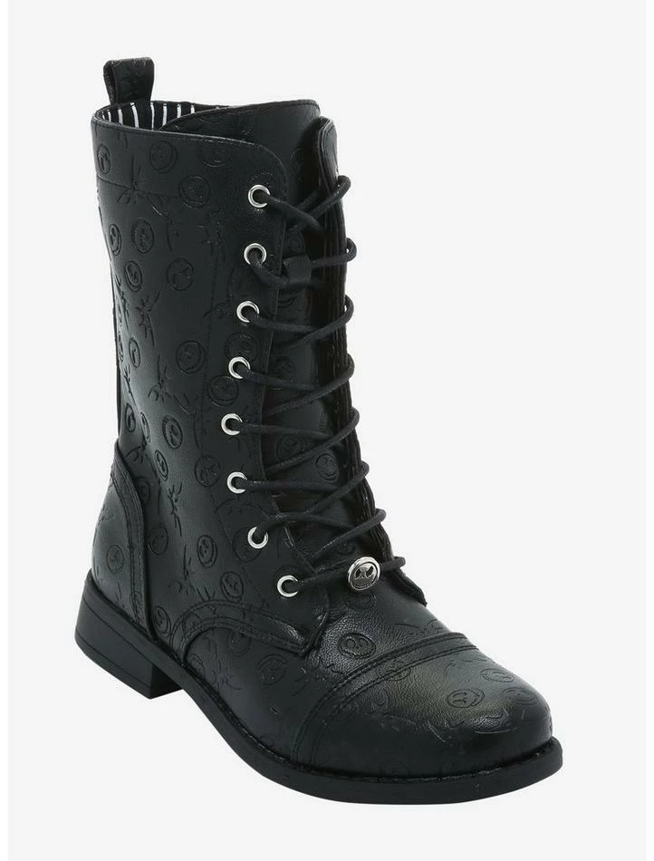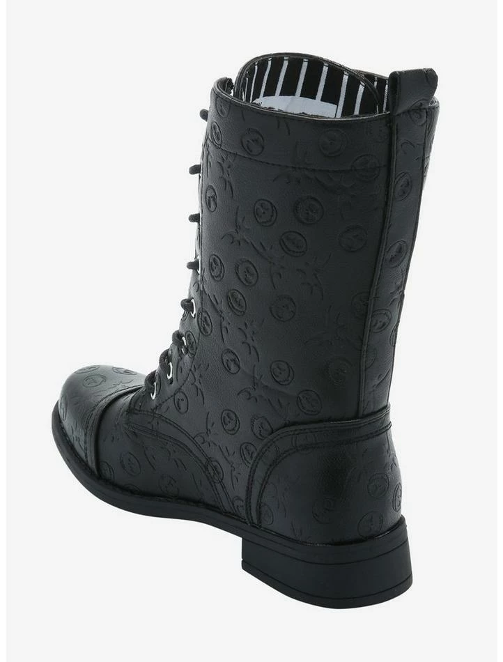 Venturing out of Halloween Town? Grab these black combat boots from The Nightmare Before Christmas featuring debossed Jack Skellington heads and bats all over, Jack head shoelace charm, pinstripe lining and lace-up closure.