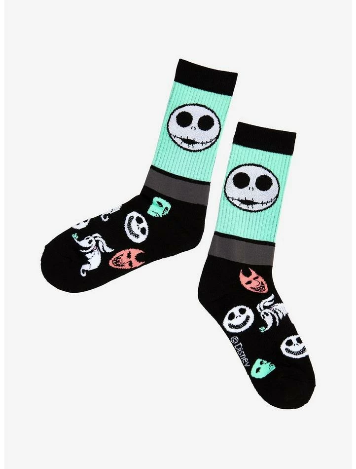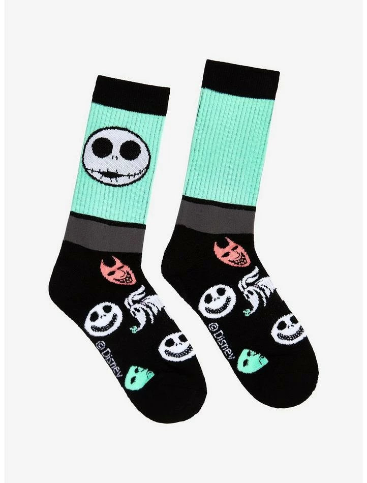 Step into Halloween Town repping your town faves! These The Nightmare Before Christmas crew socks feature neon blue and black color-blocking, with Jack’s face highlighted at the ankle, plus a toss of Oogie’s boys and Zero at the foot.