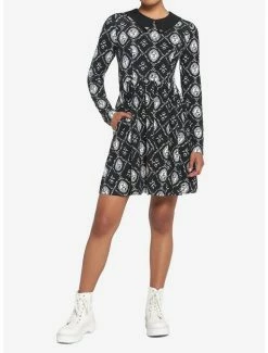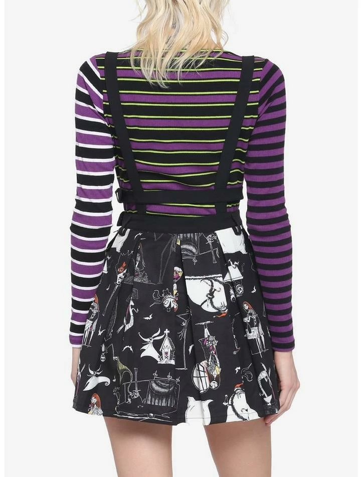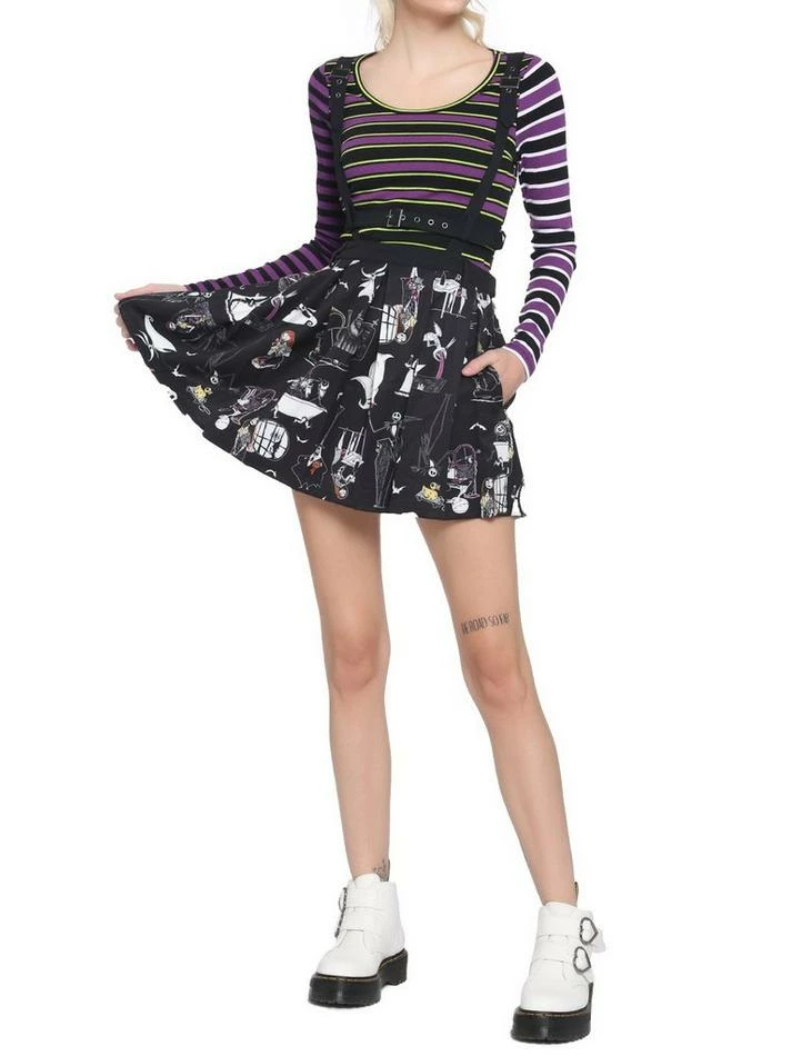 For it is plain as anyone can see, you and this skirt are simply meant to be! From The Nightmare Before Christmas, this harness suspender skirt features adjustable buckle straps and an allover print of characters from the iconic film.