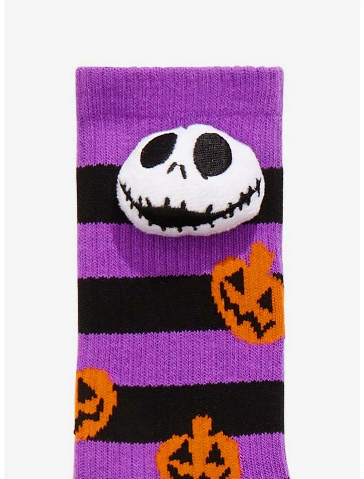 Stalk your way into Halloween Town dressed with fright in these The Nightmare Before Christmas crew socks! Featuring a vibrant purple and black striped design, tossed with smiling jack-o’-lanterns and topped off with 3D plush detailing of Jack’s head.