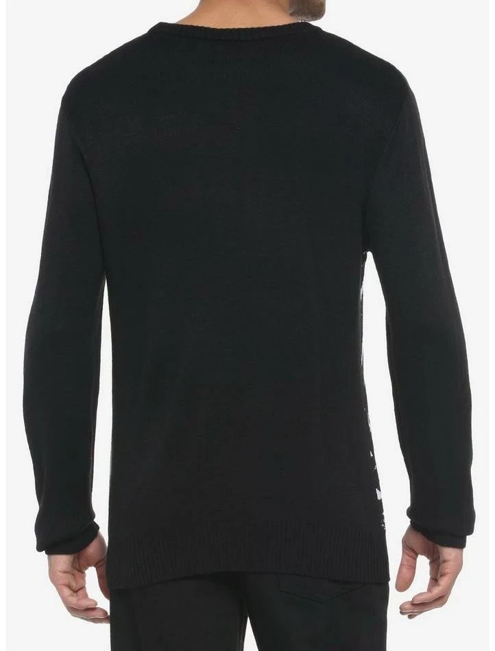 What’s this? What’s this? A cozy sweater to keep you warm when you feel that bone-chilling wind! Rep the Pumpkin King with this intarsia sweater, featuring Jack Skellington grinning over a spiral background.