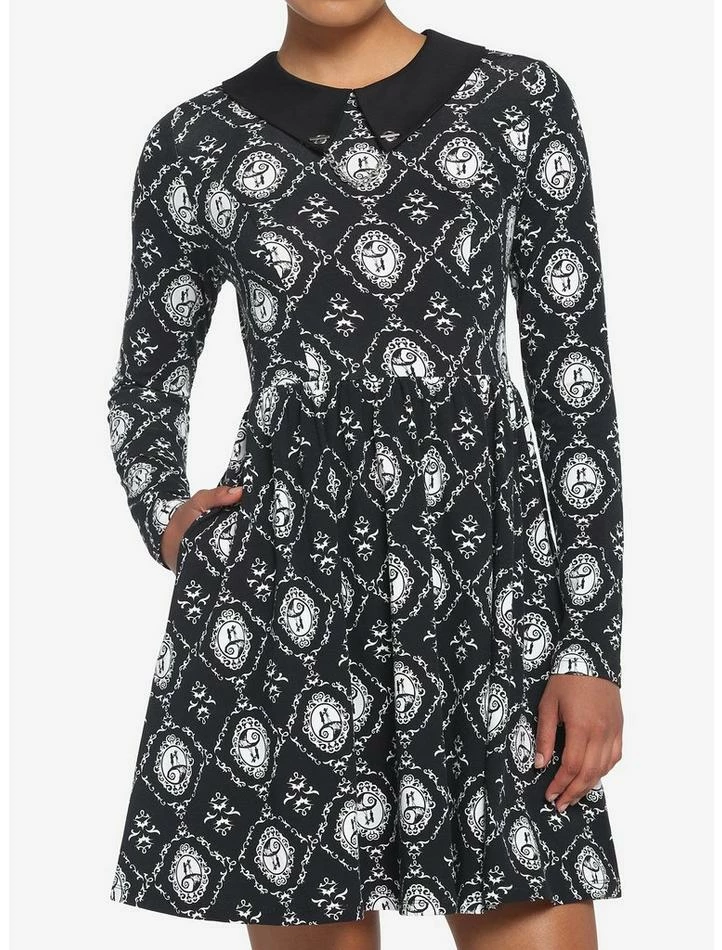 Going on a date night, graveyard stroll? Dress for the occasion in this The Nightmare Before Christmas dress! Featuring an allover cameo print of Jack and Sally on the hilltop. Comes with a Peter Pan collar with removable chain detailing, a back key hole closure and side seam pockets. Plus, it has an elasticated waistband for comfort.