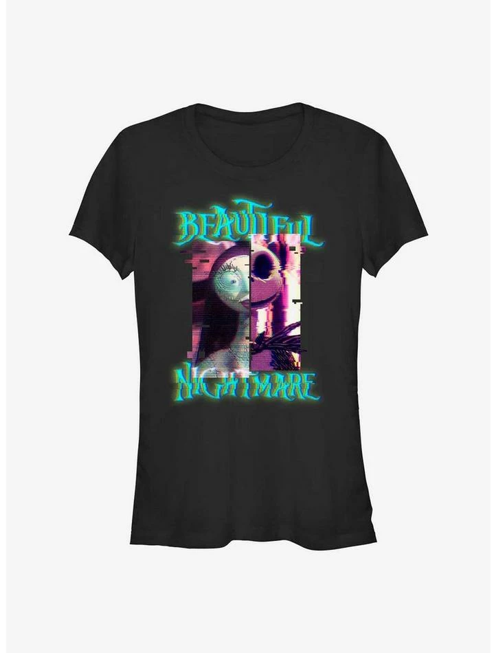 And what a beautiful nightmare it is! This fitted, lightweight black graphic tee — with Jack and Sally from The Nightmare Before Christmas — features a glitchy, split screen take of your favorite rag doll and bone daddy.