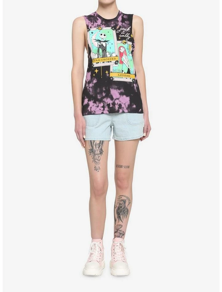 The cards have spoken – you and this muscle tank are simply meant to be! Rep the best couple in Halloween Town with this tie-dye muscle tank top, featuring Jack & Sally in a tarot-inspired print with “Star-crossed lovers” on the cards. Their names are also printed on the chest in cursive, with stars printed all over.