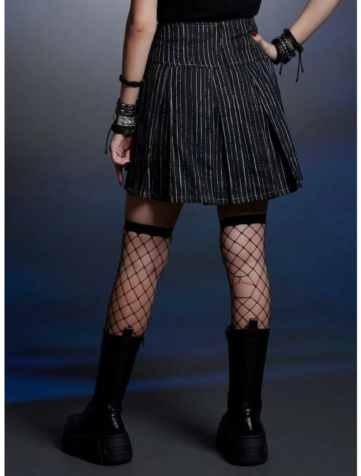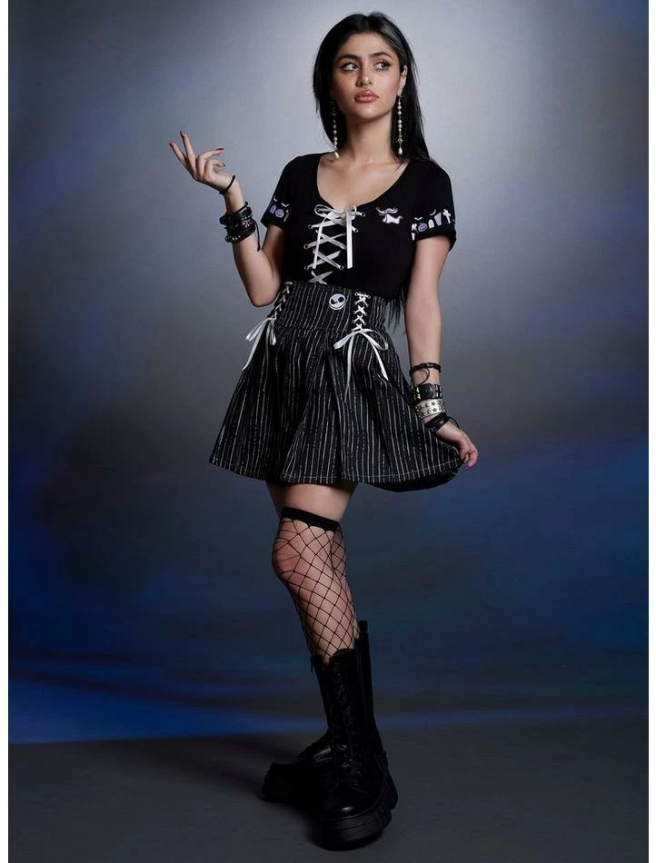 All hail the Pumpkin King! Get a look that will make flesh crawl with this The Nightmare Before Christmas skirt! Featuring Jack Skellington’s signature pinstripe pattern. Comes with a wide yoke waistband with Jack’s face embroidered at the hip and lace-up detailing. Complete with back zipper closure.