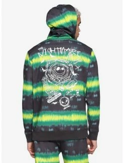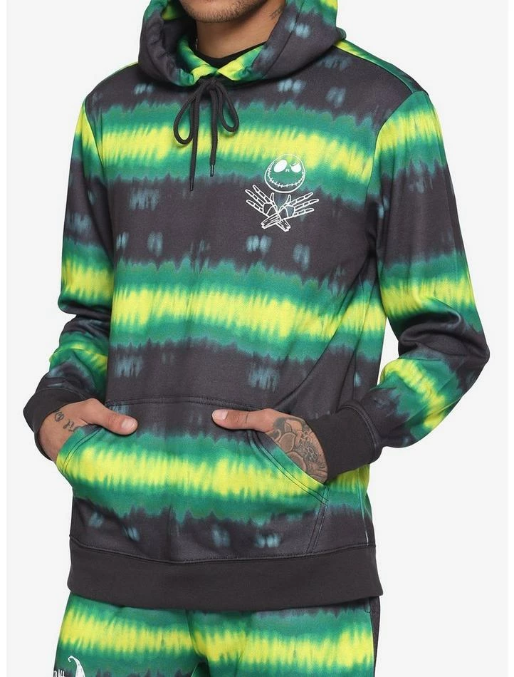 Spiral down to Halloween Town in this black hoodie featuring neon green tie-dye stripes with a spiral graphic of Jack Skellington heads and bats.ย