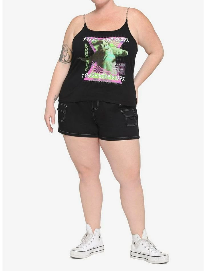 We’re not jokin’. We’ve got another Oogie Boogie top to add to your closet! Thisย The Nightmare Before Christmasย cropped cami features a neon video game-inspired design of Oogie Boogie, over a grid print and Japanese text. Comes with silver-tone chain straps.