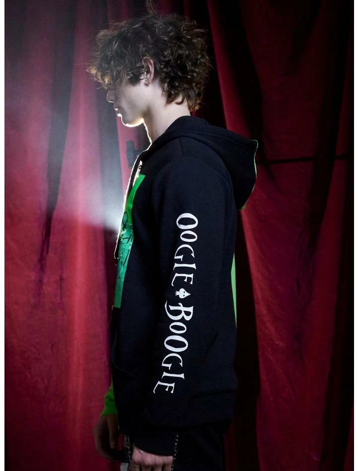 Roll the dice with Oogie Boogie! This hoodie features a split green and black design with graphic of Oogie Boogie on the front, “Roll the dice” on the right sleeve and “Oogie Boogie” on the left sleeve.