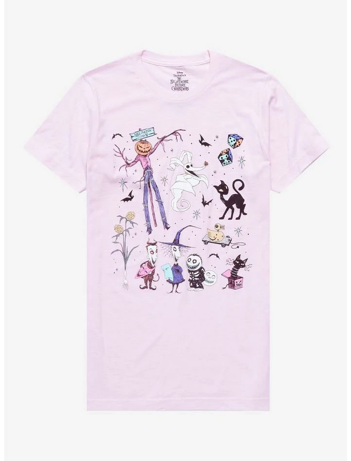 We’re making spirits bright with this frightfully fun tee! Add something vibrant to your The Nightmare Before Christmasย collection with this pink tee, featuring a collage design of Halloween Town icons and inhabitants like Lock, Shock and Barrel, Zero, Oogie Boogie’s dice and more!