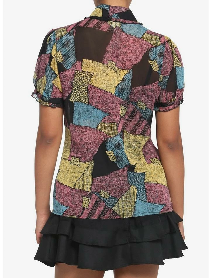Rep Halloween Town’s number one fashionista in this The Nightmare Before Christmas button-up! Inspired by Sally’s dress, this sheer top features an allover patchwork print and puff sleeves. Comes with pleats down the front, Peter Pan collar and a velvet tie-front ribbon.
