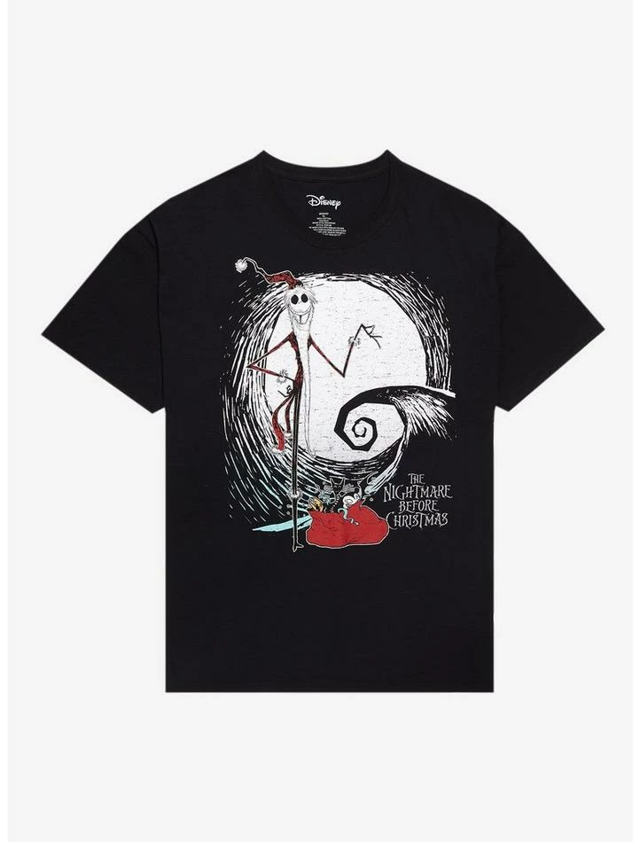 The Nightmare Before Christmas is as much an ode to Christmas as it is to Halloween. This tee inspired by the movie shows Jack Skellington in his Sandy Claws ‘fit with a bag of haunted toys below him and Spiral Hill in the background.