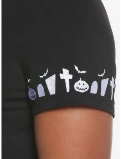 ย If you’re spending some time in the Halloween Town graveyard, you just might run into Zero! Thisย The Nightmare Before Christmasย top features your favorite ghost pup embroidered at the chest, and tombstones, pumpkins and bats embroidered around the sleeve. Complete with lace-up detailing down the front.