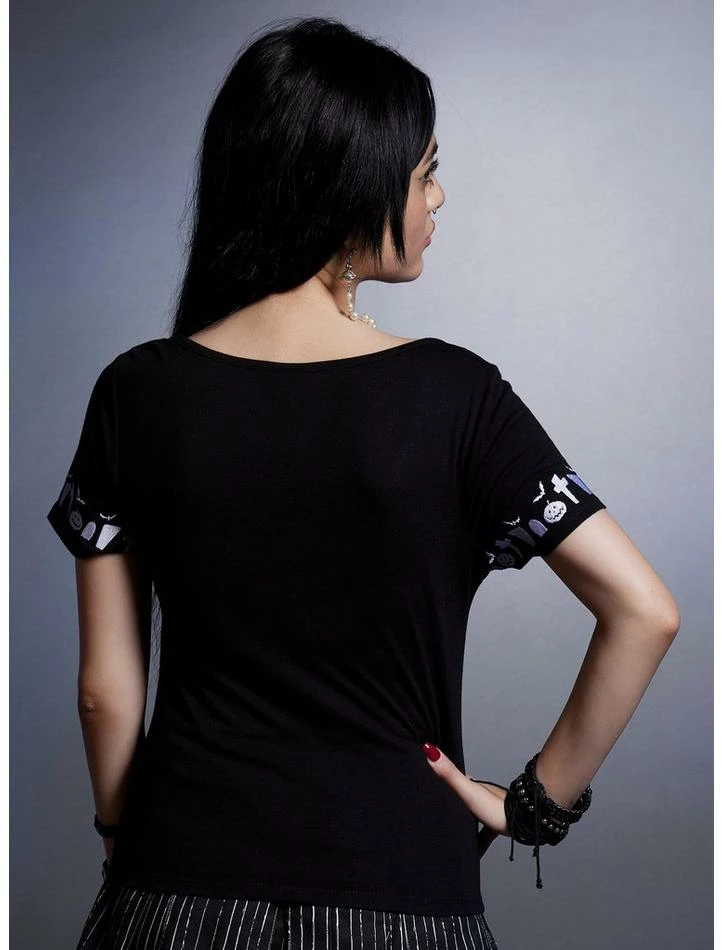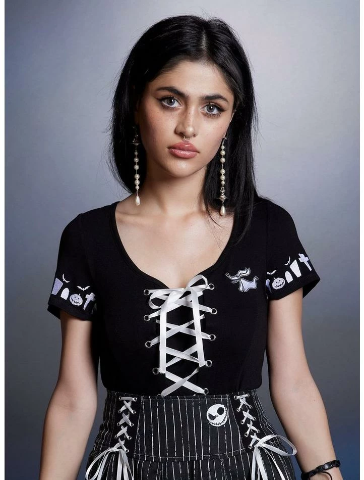 ย If you’re spending some time in the Halloween Town graveyard, you just might run into Zero! This The Nightmare Before Christmas top features your favorite ghost pup embroidered at the chest, and tombstones, pumpkins and bats embroidered around the sleeve. Complete with lace-up detailing down the front.
