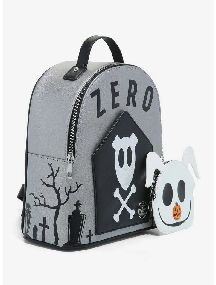 Trust Zero to guide you home on the darkest nights, and to protect your belongings with this mini backpack! From The Nightmare Before Christmas, your favorite ghost dog comes to life as a mini coin pouch connected to the backpack on a silver tone chain. The backpack resembles Zero’s tombstone, with his name printed on top and the signature skull door doubling as a front pocket! Interior pockets, adjustable straps and top carrying handle.